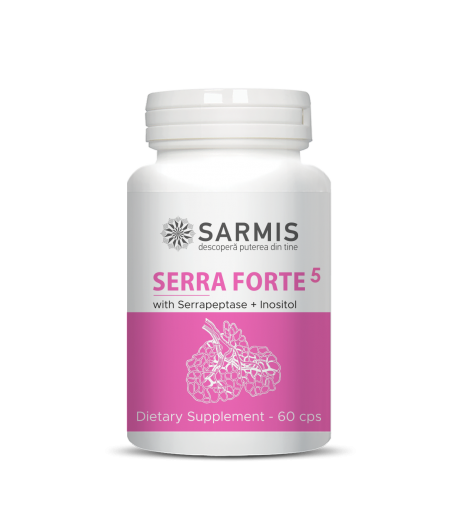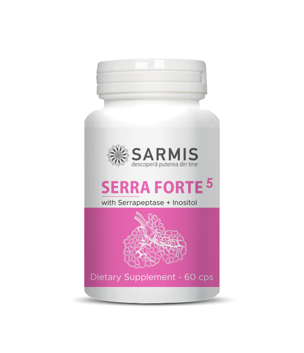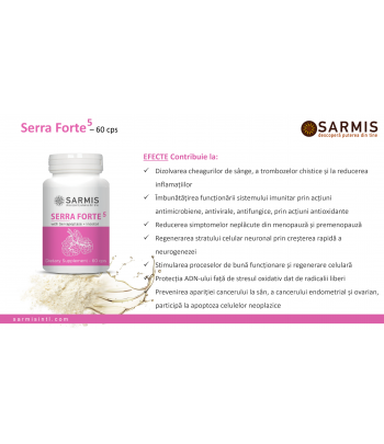 Serra Forte5 Sarmis, previne apariția trombilor in vasele de sânge, dizolvă cheagurile de sânge, elimina mucusul si reduce inflamația din plămâni. În urma studiilor efectuate s-a demonstrat ca serapeptaza reduce placile de aterom si la diminuarea venelor varicoase. Îmbunătătește circulația periferică.
