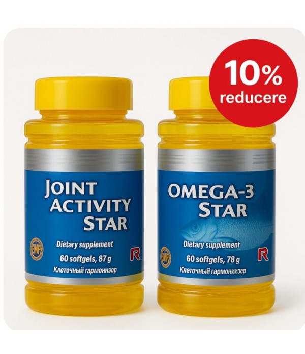 Joint Activity Star + Omega 3 este un pachet nutritiv avansat conceput pentru susținerea sănătății articulațiilor oaselor ligamentelor și mușchilor. Formula combină ingrediente cunoscute pentru rolul lor în menținerea mobilității flexibilității și confortului articular.